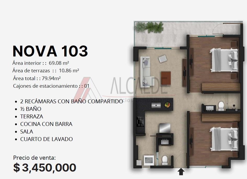 - Depa 103 en el nivel 1, de 69.08 m2, terraza de 10.86 m2, cuenta con 2 recamaras, 1 baño y medio, terraza, sala, cocina con barra, cuarto de lavado.