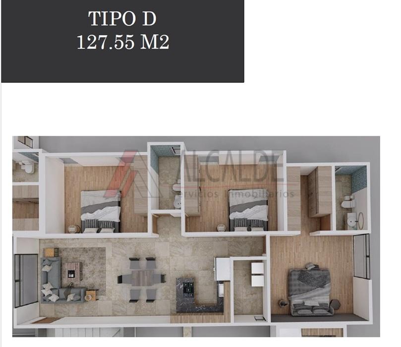Todos los departamentos son de 3 recamaras la principal con baño y vestidor, la otras 2 recamaras con closet, sala-comedor, cocina integral con cubierta de granito, cuarto de lavado, estacionamiento para 2 o 3 autos, las recamaras cuentan con piso laminado.