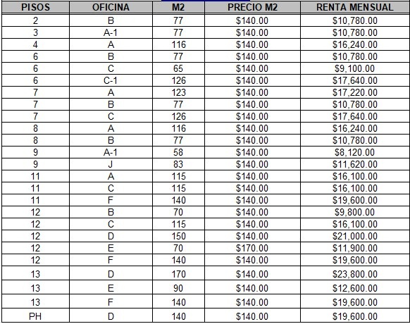 Son 25 oficinas en diferentes pisos, el edificio cuenta con 13 pisos cuenta con elevador, recepción, vigilancia y estacionamiento propio, están en excelente ubicación.